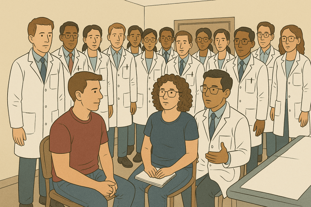 Picture this: me and Justin, in the regular chairs (not the white-paper exam chair), notebook in hand with 13 well thought out questions. Dr. Merchant walked in with a team of nine. Yep, nine. This is a teaching hospital, and I support that. I said to Justin, “Let them watch—this is who’s going to treat patients like me in the future.”